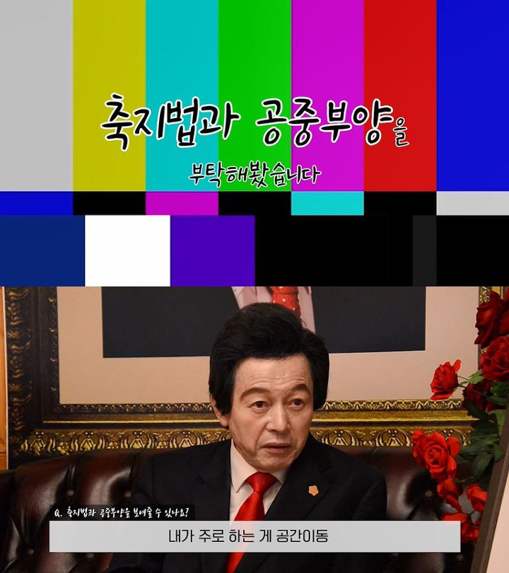 허경영 공중부양, 축지법 잘 하는 꿀팁 大공개(영상) 허경영. ′허경영′ 하면 빼놓을 수 없는 아이콘은 바로 공.중.부.양결국 허경영 대표와 장성규의 공중부양이 시작되는데.′다리 들어올리기′부터 계속 허본좌보다 오래 버티는 장성규 아나운서의 반항!
